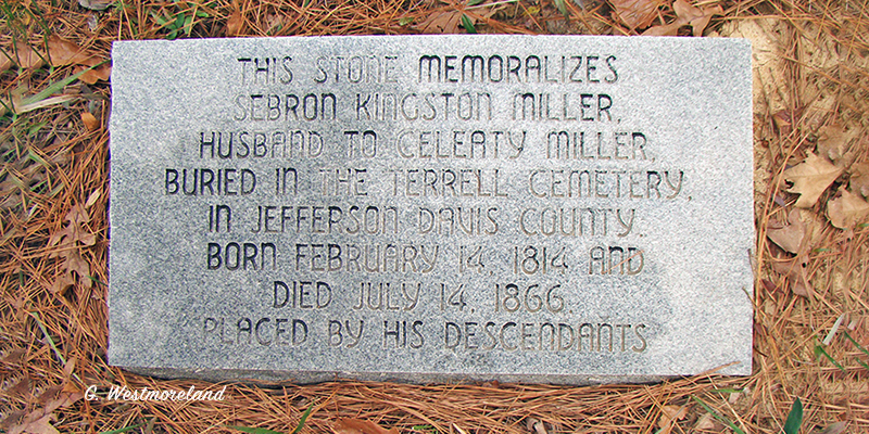 "This stone memoralizes Sebron Kingston Miller, Husband to Celeaty Miller, buried in the Terrell Cemetery in Jefferson Davis County. Placed by his dependants."